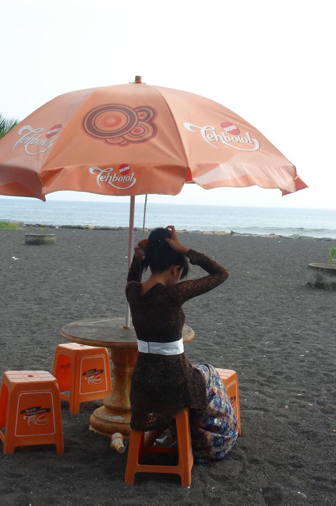 Tikrai nepastebėjome, kaip pradėjo saulė leistis. Todėl pirmąją dieną labai toli nenuvažiavome – jau sutemus pasiekėme Padang Bay, jame ir apsistojome. Tai miestukas garsėjantis balto smėliuko paplūdymiu, kadangi įprastai Bali pakrantėse jūra skalauja juodą povulkaninės kilmės smėlį (nors man sunkoka šiuos akmenukus smėliu pavadinti J ). Atvykę naktį nieko nesupratome apie šį miestelį, tad nusprendėme pasiaiškinti dieną. Tačiau dieną taip pat niekas nepaaiškėjo….. Mažiukas kaimukas šalia didelės įlankos, kuri visa yra naudojama kaip prieplauka. Ir krūva laivukų, siūlančių nuplukdinti į šalia esančias mažytes, bet kiek girdėjau, tikrai gražias saleles. Tačiau mes, išgėrę eilinę rytinę šviežių papajų sulčių dozę, išvažiavome ieškoti to balto smėlio paplūdymio…. Ir…… radome………gal penkis metrus “pliažo” toje pačioje prieplaukoje, tarp tų pačių laivų……. J Žodžiu, visus gidus reikia labai atsargiai skaityti, nes mūsų suvokimas nuo to, kas parašyta gali labai stipriai skirtis J
